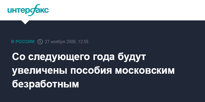 Москва. 27 ноября. INTERFAX.RU - С нового года пособие по безработице в столице будет увеличено, сообщил четверг на пресс-конференции начальник управления государственной службы занятости Москвы Сергей Дудников.