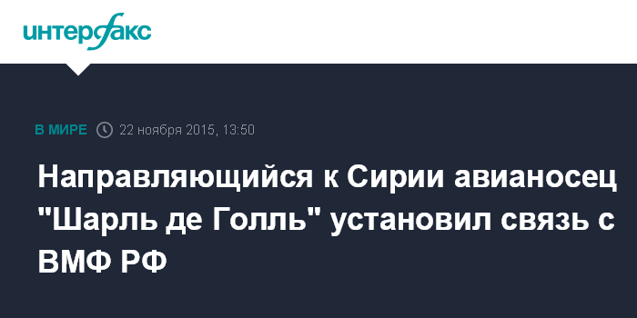 Москва. 22 ноября. INTERFAX.RU - Французский авианосец "Шарль де Голль", приближающийся к Сирии, наладил связь с находящимися в том же районе кораблями ВМФ России, сообщает в воскресенье парижская радиостанция Europe 1.