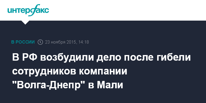 Москва. 23 ноября. INTERFAX.RU - Следственное управление СКР по Ульяновской области возбудило уголовное дело по факту убийства жителей региона, работавших в авиакомпании "Волга-Днепр", в столице Мали (ч.4 ст.206 УК РФ - захват заложников, пункты "а", "ж" ч.2 ст.105 УК РФ - убийство).
