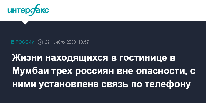 Москва. 27 ноября. INTERFAX.RU - Генконсульство РФ в Мумбаи установило телефонную связь с тремя гражданами России, находящимися в захваченной террористами гостинице, жизни россиян ничего не угрожает.