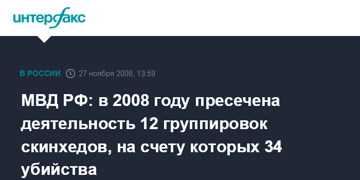 МВД РФ: в 2008 году пресечена деятельность 12 группировок скинхедов, на счету которых 34 убийства