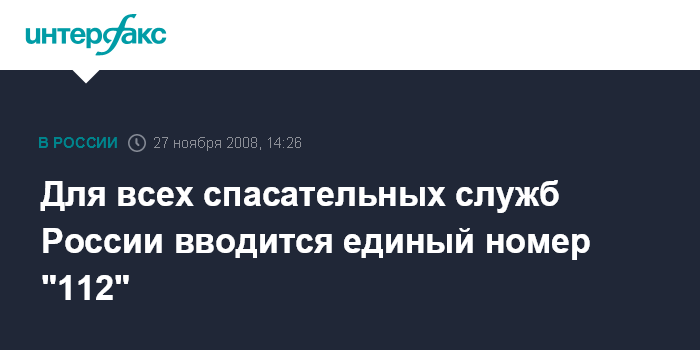 Москва. 27 ноября. INTERFAX.RU - В рамках Федеральной программы "Безопасность дорожного движения" для более эффективного оповещения об авариях в России будет введен единый телефонный номер для всех спасательных служб - "112".