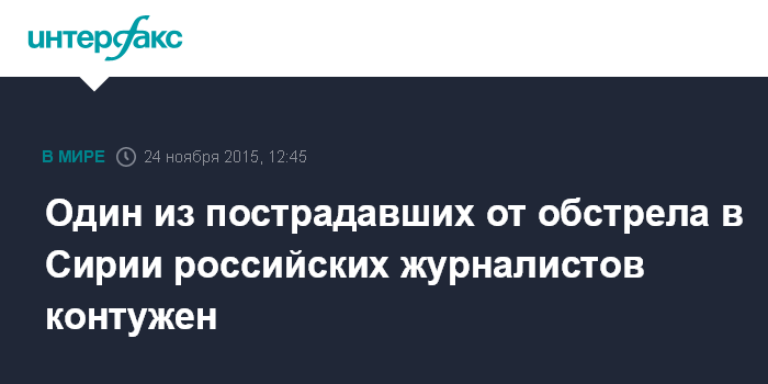 Ранее "Интерфаксу" сообщили в Минобороны РФ, что 23 ноября при выезде группы российских журналистов на передовые позиции сирийской правительственной армии в район населенного пункта Дагмашлия к стратегической высоте Зуаек их машины были обстреляны из ПТУР "Тоу". Три российских журналиста были легко ранены, один из них - контужен.