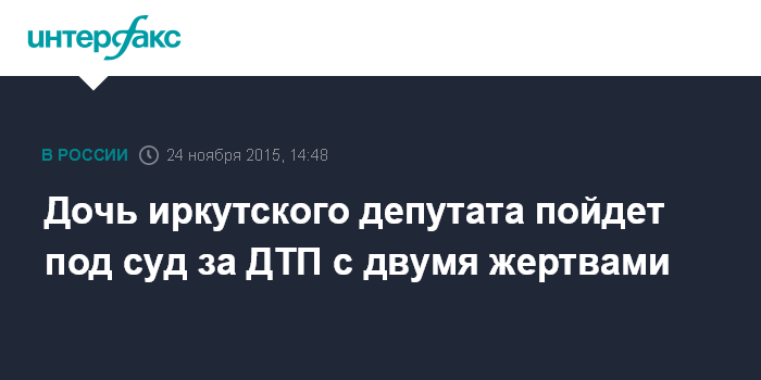Москва. 24 ноября. INTERFAX.RU - Следователи направили в суд уголовное дело дочери депутата городской думы Иркутска Юлии Киселевой о ДТП, в результате которого погибли два человека, сообщает пресс-служба управления СКР по Иркутской области.