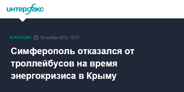 Москва. 25 ноября. INTERFAX.RU - Движение троллейбусов приостановлено в крымской столице - Симферополе - со среды, 25 ноября, на время ЧС в Крыму для экономии электроэнергии, их заменили автобусами, сообщила пресс-служба министерства транспорта Крыма.