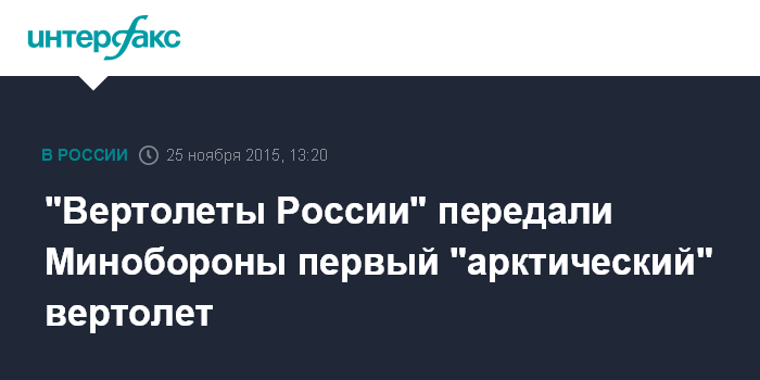 Москва. 25 ноября. INTERFAX.RU - Вертолет Ми-8АМТШ-ВА производства Улан-Удинского авиационного завода, предназначенный для арктической группировки войск, передан Минобороны России, сообщает пресс-служба холдинга "Вертолеты России".