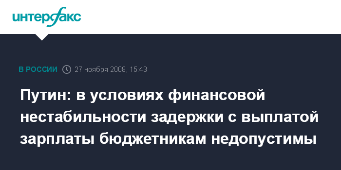 Москва. 27 ноября. INTERFAX.RU - Премьер-министр РФ Владимир Путин заявил о недопустимости каких бы то ни было задержек с выплатой зарплаты бюджетникам в условиях финансовых сложностей, с которыми сталкивается страна.