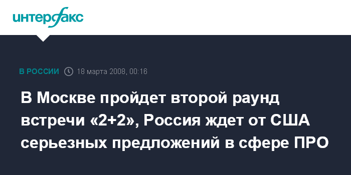 Москва. 18 марта. ИНТЕРФАКС - Второй раунд российско-американской встречи в формате "2+2" с участием глав внешнеполитических и оборонных ведомств двух стран Сергея Лаврова, Анатолия Сердюкова, Кондолизы Райс и Роберта Гейтса состоится во вторник в Москве.