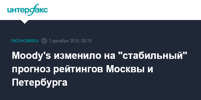 Москва. 7 декабря. INTERFAX.RU - Международное рейтинговое агентство Moody's Investors Service изменило с "негативного" на "стабильный" прогноз рейтингов Москвы, Санкт-Петербурга, четырех регионов и трех госкомпаний, подтвердив их на текущих уровнях.