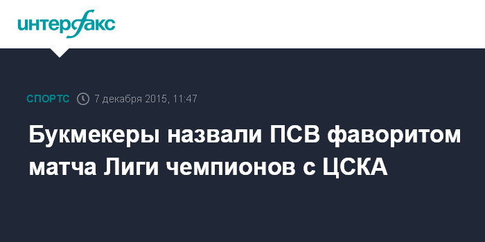 Москва. 7 декабря. INTERFAX.RU - Голландский ПСВ является фаворитом матча шестого тура группового этапа Лиги чемпионов УЕФА против московского ФК ЦСКА, свидетельствуют котировки британской букмекерской конторы William Hill.