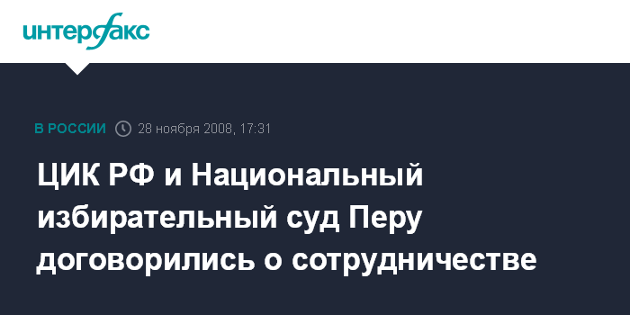 Москва. 28 ноября. INTERFAX.RU - Центризбирком РФ договорился об обмене информацией и технологиями с Национальным избирательным судом Перу. "Мы открываем прямую электронную линию связи", - сообщил в эфире телеканала "Вести 24" председатель ЦИК РФ Владимир Чуров. Он напомнил, что соответствующее соглашение о сотрудничестве было подписано в рамках визита президента РФ Дмитрия Медведева в Лиму.