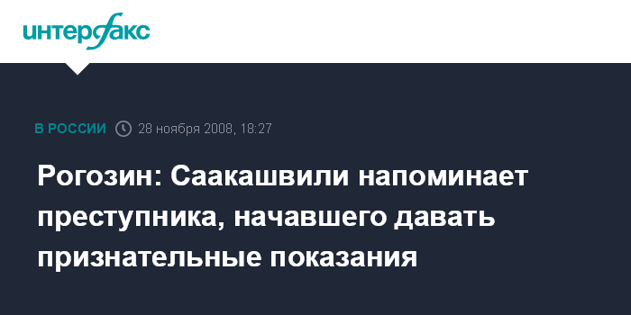 "Саакашвили напоминает такого матерого преступника, который перед лицом неопровержимых доказательств начинает признавать то одно, то другое, то третье, но рассчитывать на его чистосердечное раскаяние в совершенном преступлении наивно", - сказал "Интерфаксу" в пятницу Рогозин, комментируя признания М.Саакашвили, сделанные на заседании парламентской комиссии по расследованию августовского кризиса на Кавказе.