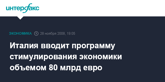 Москва. 28 ноября. INTERFAX.RU - Италия объявила о запуске программы по стимулированию экономики общим объемом 80 млрд евро, включающей в себя денежную поддержку наиболее бедных семей, введение ограничений на ставки по ипотечным кредитам, а также увеличение расходов на общественные проекты, сообщает агентство Bloomberg.