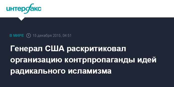 Москва. 15 декабря. INTERFAX.RU - Председатель Объединенного комитета начальников штабов ВС США генерал Джозеф Данфорд подверг критике усилия Вашингтона по организации контрпропаганды идей радикального исламизма в стране.