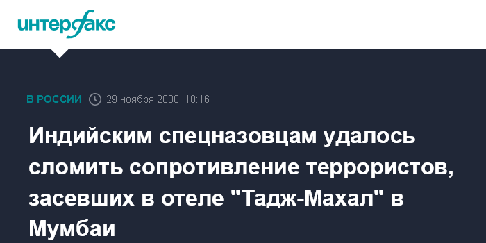 Этот отель стал местом последнего драматического столкновения спецназа и террористов в ходе трагедии в Мумбаи. "Один или двое террористов из состава группы, совершившей серию терактов в крупнейшем деловом центре страны, смогли закрепиться на 2-м этаже угловой части здания и на протяжении более 10-ти часов оказывали ожесточенное сопротивление брошенным на штурм спецназовцам", - говорится в сообщении.