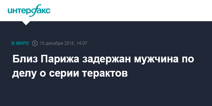 Москва. 15 декабря. INTERFAX.RU - Французские полицейские задержали во вторник мужчину в рамках расследования серии терактов, совершенных в Париже и Сен-Дени 13 ноября, сообщает местное телевидение.