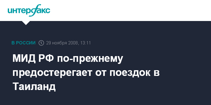 Москва. 29 ноября. INTERFAX.RU - МИД России вновь предупредил о нежелательности поездок в Таиланд до нормализации обстановки в этой стране.