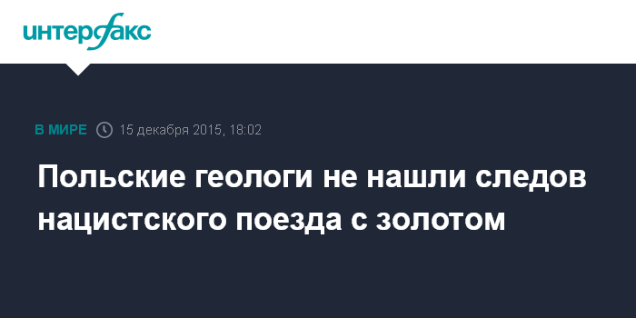 Москва. 15 декабря. INTERFAX.RU - Польские эксперты-геологи сообщают, что не нашли никаких следов нацистского поезда, якобы сокрытого в пещерах близ польского города Валбжиха, сообщает агентство Associatd Press.
