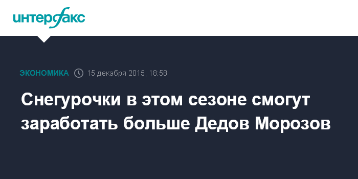 Москва. 15 декабря. INTERFAX.RU - Предлагаемая в этом году в России заработная плата для Снегурочек оказалась на 8 тысяч рублей выше, чем зарплата Дедов Морозов - около 46 тысяч и около 38 тысяч рублей соответственно, сообщает пресс-служба рекрутингового портала HeadHunter со ссылкой на свое исследование.