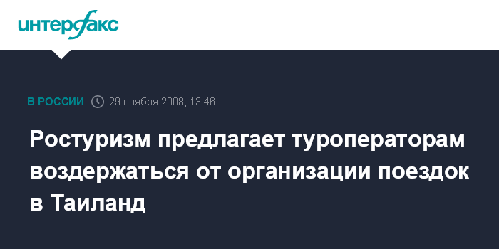 Москва. 29 ноября. INTERFAX.RU - Ростуризм готовит сообщение для туристических фирм о том, что в Таиланде есть прямая угроза жизни и безопасности российских туристов, и им стоит воздержаться от организации туров в эту страну.