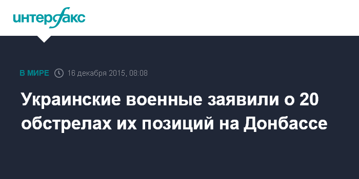 Москва. 16 декабря. INTERFAX.RU - Пресс-центр штаба силовой операции украинских военных на юго-востоке страны в среду утром опубликовал на своей странице в фейсбуке сообщение, в котором утверждается, что в ночь на среду позиции украинских военных в Донбассе якобы 20 раз были обстреляны с целью вызвать ответный огонь украинских подразделений.