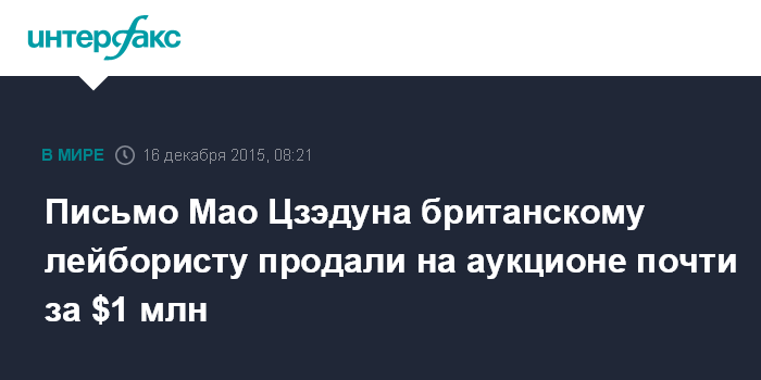 Москва. 16 декабря. INTERFAX.RU - За 600 тысяч фунтов-стерлингов ($902, 85 тысяч) было продано письмо основателя КНР Мао Цзэдуна лидеру британских лейбористов Клементу Эттли на аукционе "Сотбис" в Лондоне, сообщили СМИ с места события.