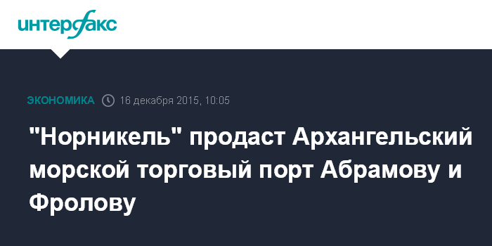 Москва. 16 декабря. INTERFAX.RU – Совет директоров ГМК "Норильский никель" одобрил продажу 74,78% акций ОАО "Архангельский морской торговый порт". Покупателем выступит компания Osoblanco Holdings Limited, связанная с Invest AG (управляет активами основателей Evraz Александра Абрамова и Александра Фролова), одним из акционеров ГМК.