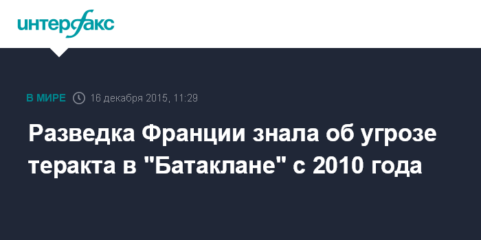 Москва. 16 декабря. INTERFAX.RU - Спецслужбы Франции получали информацию о возможной угрозе теракта в парижском концертном зале "Батаклан" с 2010 года, пишет в среду французское издание Le Canard enchaine ("Канар аншене" - ИФ) со ссылкой на собственные источники.