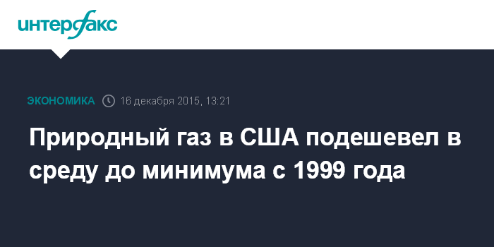 Москва. 16 декабря. INTERFAX.RU – Внутридневная цена природного газа в США упала до самой низкой отметки за 16 лет в ходе электронных торгов на Нью-йоркской товарной бирже в среду, сообщает агентство Bloomberg.