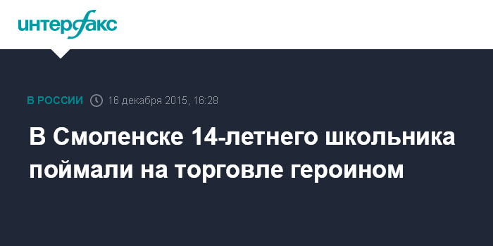 Москва. 16 декабря. INTERFAX.RU - Наркополицейские Смоленска задержали 14-летнего школьника, промышлявшего распространением героина, сообщает пресс служба регионального УФСКН.