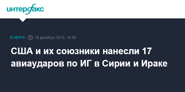 Москва. 16 декабря. INTERFAX.RU - ВВС США и их союзников уничтожили базу террористов в Ираке, всего нанесли за вторник 17 ударов по позициям ИГ (террористическая организация, запрещенная в РФ) в Сирии и Ираке, сообщили в среду в командовании созданной Вашингтоном коалиции по борьбе против террористов.