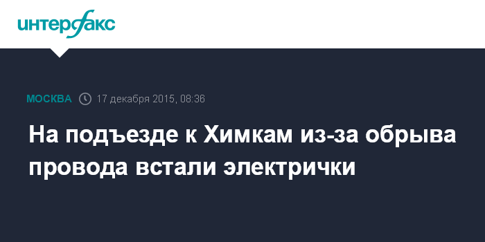 Как передает корреспондент "Интерфакса" из электрички, следовавшей по маршруту Крюково - Ленинградский вокзал, на подъезде к станции Химки пассажиры услышали довольно громкий скрежещущий звук, после чего электричка встала и машинист объявил, что оборван провод и придется ждать ремонтную бригаду. Сколько на это потребуется времени, он не пояснил.
