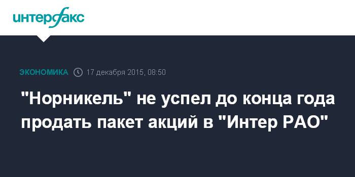 Москва. 17 декабря. INTERFAX.RU - ОАО ГМК "Норильский никель" не удалось в этом году продать принадлежащие ей акции "Интер РАО", пишет газета "Коммерсантъ" в четверг со ссылкой на источники.