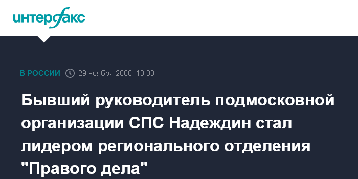 Москва. 29 ноября. INTERFAX.RU – Бывший руководитель московского областного отделения "Союза правых сил" Борис Надеждин возглавил региональное отделение партии "Правое дело", сообщила руководитель службы общественных связей партии Наталья Шавшукова.