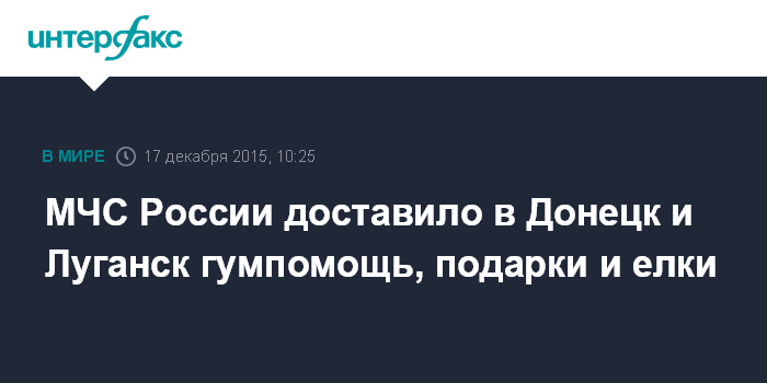 Москва. 17 декабря. INTERFAX.RU - Автоколонны очередного, 47-го по счету, гуманитарного конвоя МЧС РФ прибыли в Луганск и Донецк, где начнется разгрузка, сообщили "Интерфаксу" в пресс- службе МЧС.