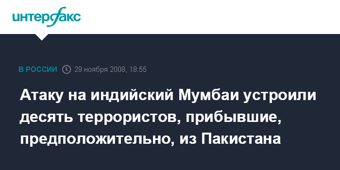 Москва. 29 ноября. INTERFAX.RU – Индийские военные заявляют, что обезвредили всех террористов, которые участвовали в атаке на Мумбаи, сообщает в субботу телеканал "Вести-24". По данным МВД Индии, их было всего 10 человек. Девять погибли в перестрелках со спецназом, еще один - у боевика пакистанский паспорт - арестован.