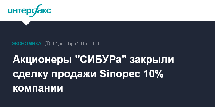 Москва. 17 декабря. INTERFAX.RU – Акционеры "СИБУРа" закрыли сделку вхождения китайской Sinopec в капитал "СИБУРа" в качестве стратегического инвестора с 10%-ной долей, говорится в сообщении российской компании.