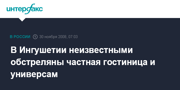 Ростов-на-Дону. 30 ноября. ИНТЕРФАКС-ЮГ - Частная гостиница обстреляна неизвестными в городе Назрани, жертв и пострадавших нет, сообщили агентству "Интерфакс-Юг" в Штабе временной группировки войск в воскресенье.