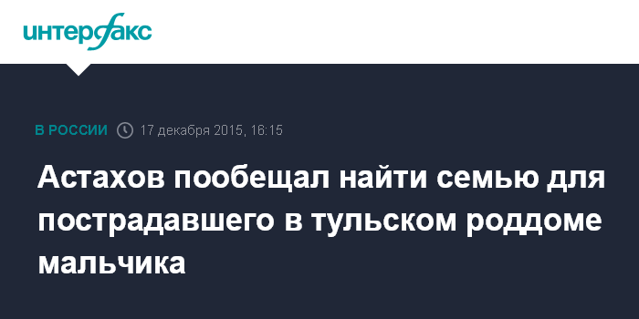 Москва. 17 декабря. INTERFAX.RU - Уполномоченный при президенте РФ по правам ребенка Павел Астахов рассчитывает, что пострадавший в Тульском роддоме мальчик будет в скором времени определен в семью.