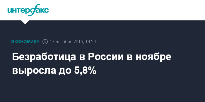 Москва. 17 декабря. INTERFAX.RU – Общая численность безработных в России в ноябре 2015 года увеличилась по сравнению с октябрем на 180 тыс. человек и составила 4 млн 435 тыс. человек, уровень безработицы повысился до 5,8% c 5,5%, следует из опубликованных в четверг данных Росстата.