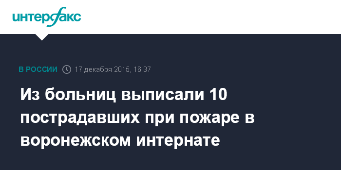 Москва. 17 декабря. INTERFAX.RU - Десять человек, получивших травмы во время пожара в психоневрологическом интернате Новохоперского района Воронежской области, выписаны из больницы и переведены в профильное соцучреждение, сообщил "Интерфаксу" заместитель главврача по медицинской части областного клинического центра медицины катастроф Игорь Воробьев.