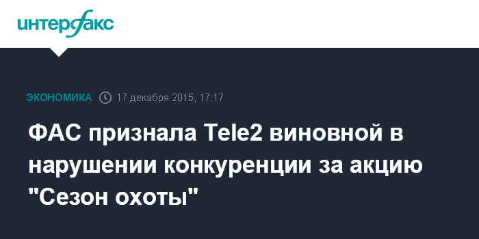 Москва. 17 декабря. INTERFAX.RU – Федеральная антимонопольная служба признала ООО "Т2 Мобайл" (бренд Tele2) виновным в нарушении закона "О защите конкуренции" за акцию "Сезон охоты", передал корреспондент "Интерфакса" с заседания комиссии ФАС. Оператору запретили вновь запускать интернет-сайт акции.