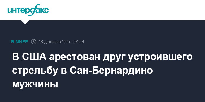 Москва. 18 декабря. INTERFAX.RU - Полиция США арестовала друга Саида Фарука, устроившего бойню в американском городе Сан-Бернардино, в результате которой погибли 14 человек, сообщают американские СМИ.