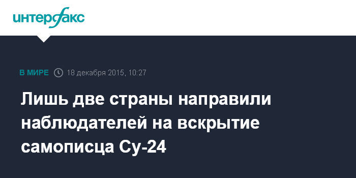 Москва. 18 декабря. INTERFAX.RU - Минобороны России пригласило представителей из 14 стран направить наблюдателей в Межгосударственный авиационный комитет (МАК), который занимается расшифровкой "черного ящика" сбитого Турцией российского самолета Су-24, а согласились Китай и Великобритания, сообщил замглавкома Военно-космических сил Сергей Дронов.
