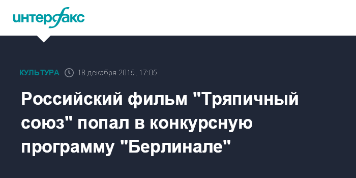 Москва. 18 декабря. INTERFAX.RU - Фильм российского режиссера Михаила Местецкого "Тряпичный союз" попал в конкурсную программу Берлинского кинофестиваля, сообщает в пятницу официальный сайт "Берлинале".