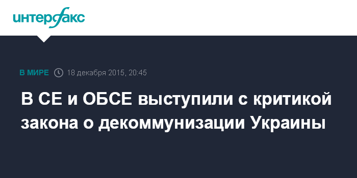 Москва. 18 декабря. INTERFAX.RU - Украинский закон о запрете пропаганды "коммунистического и национал-социалистического (нацистского) тоталитарных режимов в Украине" в целом правомерен, но не соответствует европейским законодательным стандартам, говорится в пятницу в совместном коммюнике Венецианской комиссии Совета Европы и ОБСЕ/БДИПЧ.