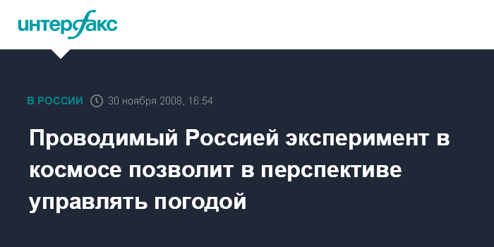 Королев (Московская область). 30 ноября. INTERFAX.RU - Российские ученые с помощью летающего в космосе грузового корабля "Прогресс М-65" проводят научный эксперимент, который в будущем позволит управлять погодой, заявил журналистам в воскресенье руководитель российского сегмента Международной космической станции Владимир Соловьев.