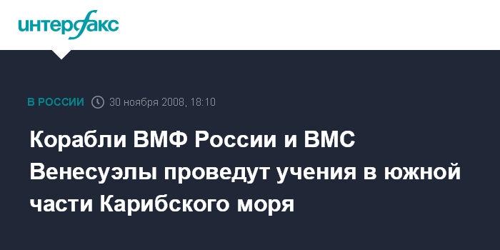 Москва. 30 ноября. INTERFAX.RU - Отряд боевых кораблей Северного флота в составе тяжелого атомного ракетного крейсера "Петр Великий", большого противолодочного корабля "Адмирал Чабаненко" и двух судов обеспечения 1 декабря примет участие в совместных российско-венесуэльских военно-морских учениях "ВЕНРУС-2008".
