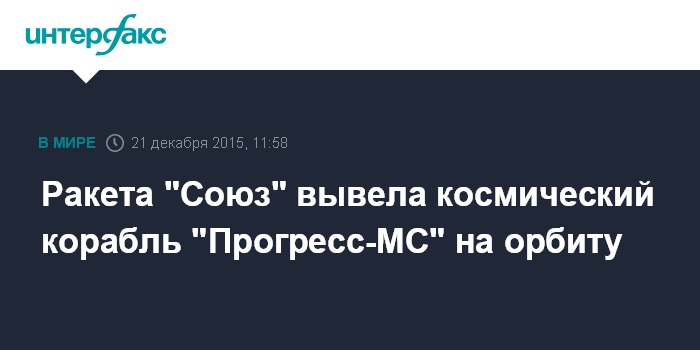 Москва. 21 декабря. INTERFAX.RU - Космический грузовой корабль "Прогресс-МС" отделился от третьей ступени ракеты-носителя "Союз-2.1а" и успешно вышел на орбиту, передает корреспондент "Интерфакса" из Центра управления полетами в понедельник.