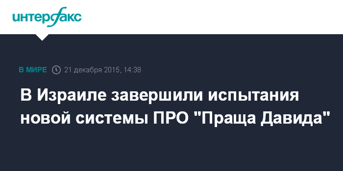 Москва. 21 декабря. INTERFAX.RU - Новая израильская система ПРО "Праща Давида" успешно прошла последнее испытание, сообщило в понедельник минобороны страны в твиттере.